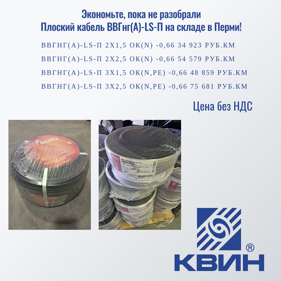 Плоский кабель ВВГнг(А)-LS-П на складе в Перми. ГОСТ. Готовые бухты.