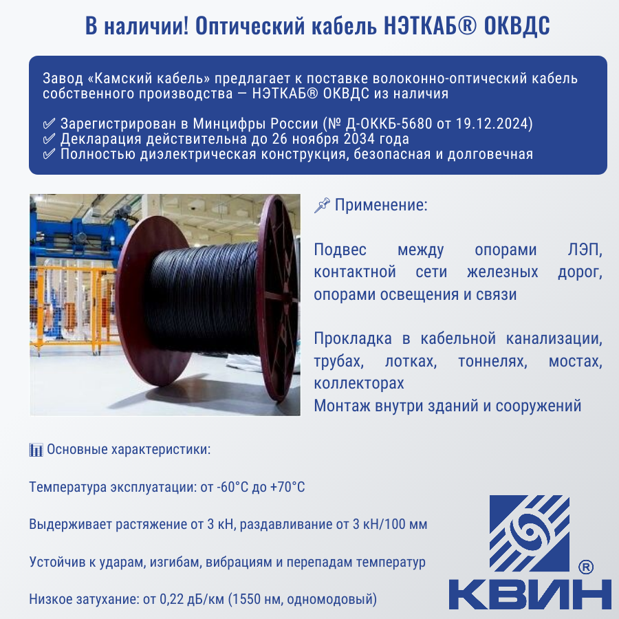 Завод «Камский кабель» предлагает к поставке волоконно-оптический кабель собственного производства — НЭТКАБ® ОКВДС из наличия.